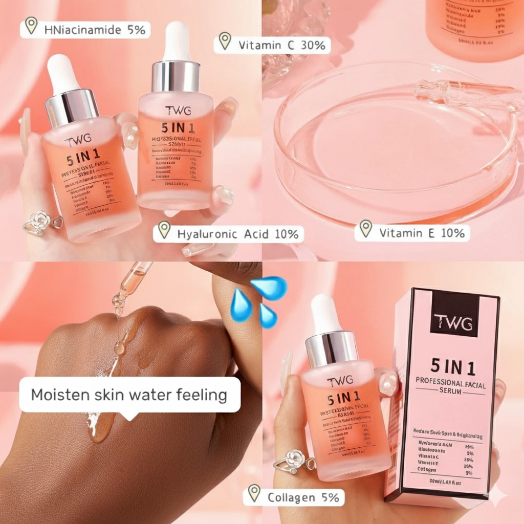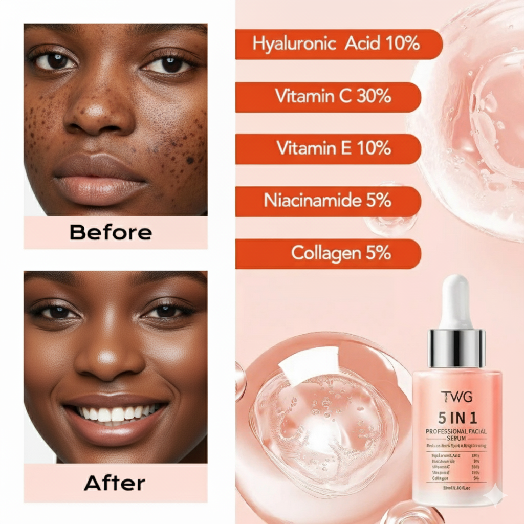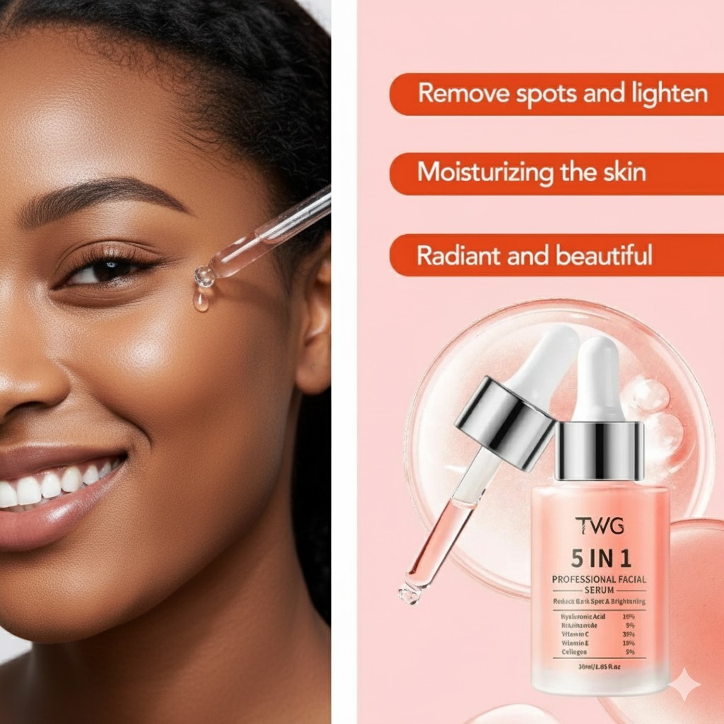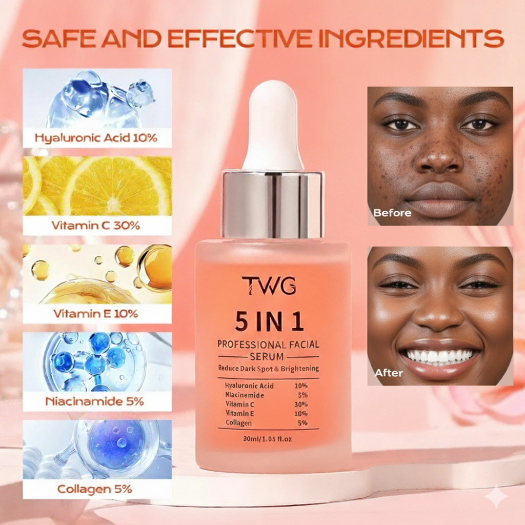 TWG 5-in-1 Facial Serum combines five dermatologist-recommended ingredients in one powerful, results-driven formulaādesigned specifically to target the most common skincare struggles of Ghanaian skin: dark spots, dryness, dullness, aging, and uneven tone.