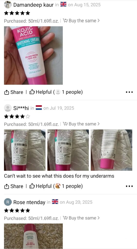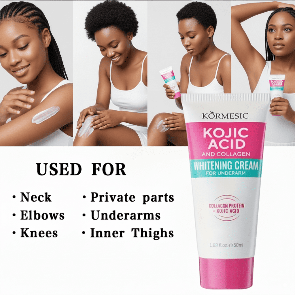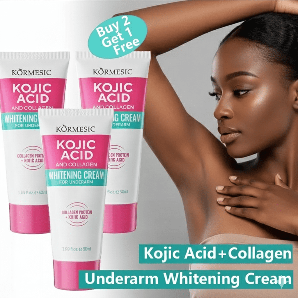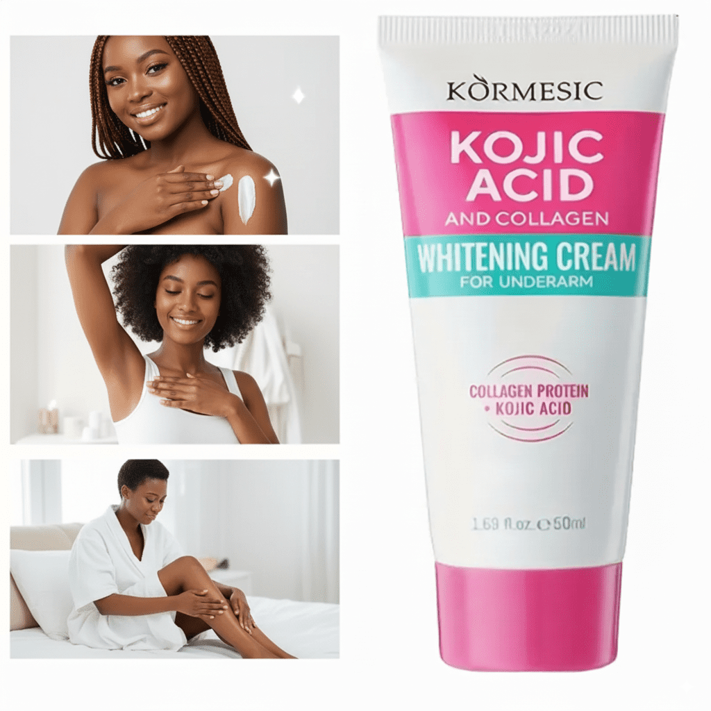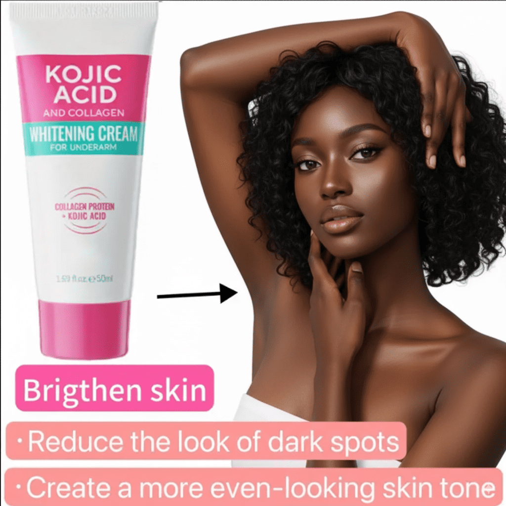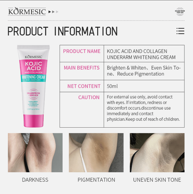 Tired of dark underarms, elbows, kness, neck, inner thighs? Tired of wasting money on whitening creams that donât work? Say hello to brighter, smoother skin youâll love to show off with the Kojic Acid & Collagen Whitening Cream.